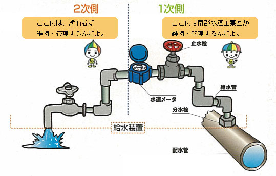ただし一次側で起きた漏水は南部水道企業団が修理しますが、2次側(メーターより家方)で起きた漏水は個人で修理依頼をしてください。