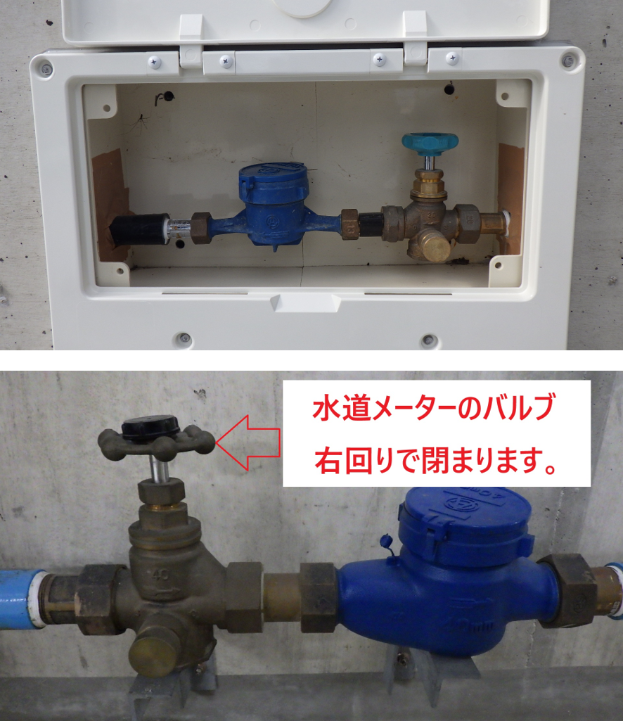 メーターボックスの中の止水栓→メーターバルブがしまっている場合は水が出ません。